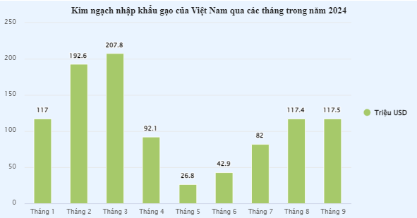 Lũy kế 9 tháng năm nay, Việt Nam đã chi 996 triệu USD để nhập khẩu các mặt hàng gạo về phục vụ nhu cầu sản xuất và tiêu dùng nội địa, tăng 57,3% so với cùng kỳ năm ngoái. Đây cũng là con số cao kỷ lục trong lịch sử, đồng thời vượt xa kim ngạch nhập khẩu 860 triệu đô la của năm 2023.
