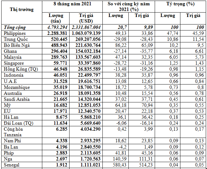 Philippines vẫn đứng đầu về tiêu thụ gạo của Việt Nam, chiếm 47,7% trong tổng lượng và chiếm 45,6% trong tổng kim ngạch gạo xuất khẩu của cả nước, đạt 2,89 triệu tấn, tương đương 1,06 tỷ USD, giá trung bình 464,6 USD/tấn, tăng mạnh 49% về lượng, tăng 33,9% về kim ngạch nhưng giảm 10,2% về giá so với 8 tháng đầu năm 2021.