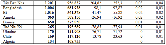 Tiếp sau đó là thị trường Trung Quốc chiếm trên 10,9% trong tổng lượng và chiếm 11,5% trong tổng kim ngạch, đạt 520.445 tấn, tương đương 269,21 triệu USD, giá trung bình 517,3 USD/tấn, giảm 29% cả về lượng và kim ngạch; giá tăng nhẹ 0,9% so với cùng kỳ năm 2021.