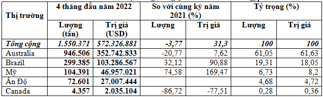 Tính chung cả 4 tháng đầu năm 2022, nhập khẩu lúa mì từ Australia đạt 946.506 tấn, tương đương 352,74 triệu USD, giá 372,7 USD/tấn, giảm mạnh 20,8% về khối lượng nhưng tăng 7,6% kim ngạch và giá tăng mạnh 35,8% so với cùng kỳ năm 2021.