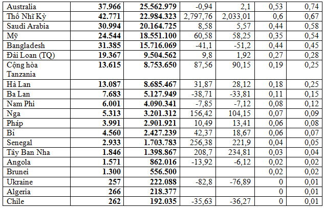 Tiếp sau đó là thị trường Trung Quốc chiếm trên 12% trong tổng lượng và tổng kim ngạch, đạt 850.949 tấn, tương đương 432,32 triệu USD, giá trung bình 508 USD/tấn, giảm 19,6% về lượng và giảm 17,3% kim ngạch; giá tăng nhẹ 2,9% so với cùng kỳ năm 2021.