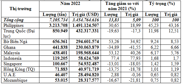 Philippines vẫn đứng đầu về tiêu thụ gạo của Việt Nam, chiếm 45,2% trong tổng lượng và chiếm 43,2% trong tổng kim ngạch gạo xuất khẩu của cả nước, đạt gần 3,22 triệu tấn, tương đương 1,49 tỷ USD, giá trung bình 464 USD/tấn, tăng 30,7% về lượng, tăng 19% về kim ngạch nhưng giảm 8,9% về giá so với đầu năm 2021.