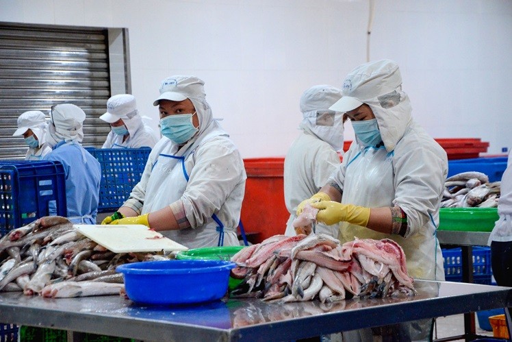 | Công nhân chế biến thủy sản xuất khẩu tại xưởng. |