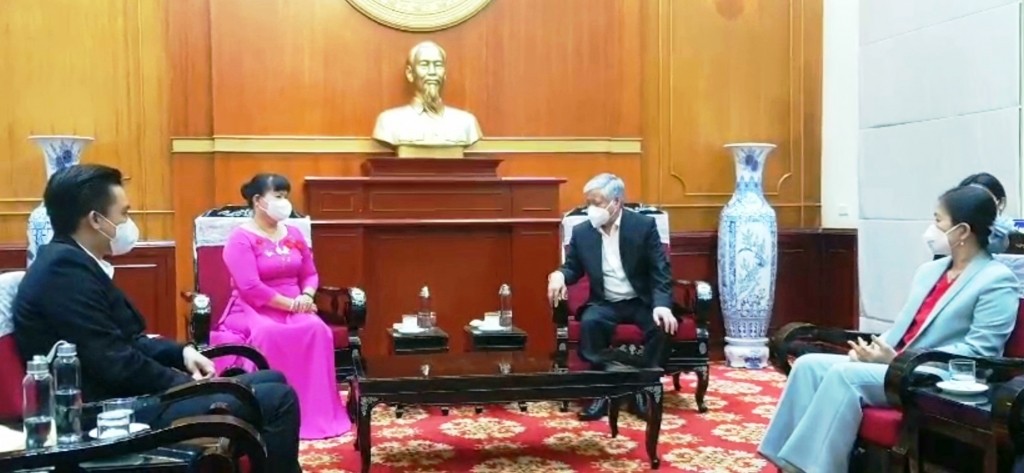 | Chủ tịch Ủy ban Trung ương Mặt trận Tổ quốc Việt Nam Đỗ Văn Chiến trò chuyện và cảm ơn tấm lòng vàng của doanh nhân Nguyễn Nam Phương và tập thể công nhân viên Công ty Lan Anh và Công ty Huy Đức. |