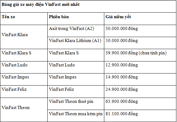 | Giá trên chỉ mang tính chất tham khảo, để có thông tin chính xác lên đến cái đại lý của VinFast để được tư vấn. |