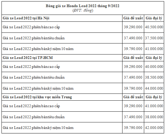 Bảng giá xe máy Honda LEAD 2022 mới nhất tháng 9/2022