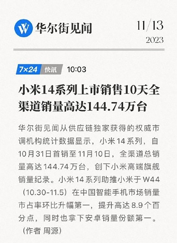 Theo Wall Street Insights, Xiaomi hiện đã bán được 1.4474 triệu điện thoại thông minh dòng Xiaomi 14 trong 10 ngày đầu tiên. Đây là kỷ lục mới dành cho dòng điện thoại cao cấp hàng đầu của Xiaomi.