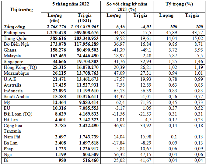 Tính chung trong 5 tháng đầu năm 2022, Philippines vẫn đứng đầu về tiêu thụ gạo của Việt Nam, chiếm 45,9% trong tổng lượng và chiếm 43,6% trong tổng kim ngạch gạo xuất khẩu của cả nước, đạt 1,27 triệu tấn, tương đương 589,81 triệu USD, giá trung bình 464,2 USD/tấn, tăng 34,6% về lượng, tăng 17,5% về kim ngạch nhưng giảm 12,7% về giá so với 5 tháng đầu năm 2021.