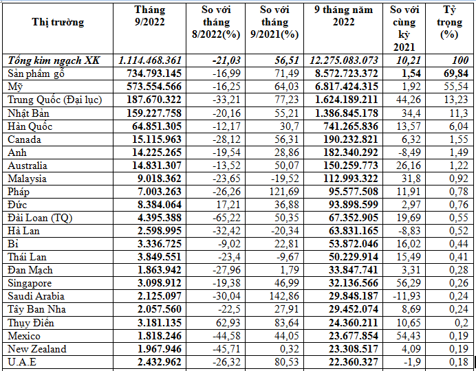 Nhóm hàng gỗ và sản phẩm gỗ của Việt Nam xuất khẩu chủ yếu sang thị trường Mỹ, riêng thị trường đã chiếm tới 55,5% trong tổng kim ngạch xuất khẩu nhóm hàng này của cả nước, đạt 6,82 tỷ USD, tăng 1,9% so với cùng kỳ năm trước, riêng tháng 9/2022 xuất khẩu sang thị trường này đạt 573,55 triệu USD, giảm 16,3% so với tháng 8/2022 nhưng tăng 64% so với tháng 9/2021.