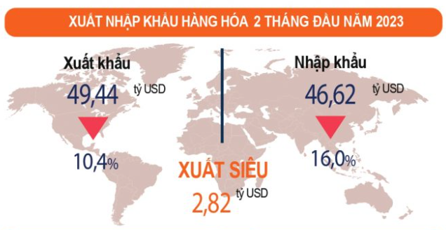 Cán cân thương mại hàng hóa tháng Hai ước tính xuất siêu 2,3 tỷ USD. Tính chung hai tháng đầu năm 2023, cán cân thương mại hàng hóa ước tính xuất siêu 2,82 tỷ USD (cùng kỳ năm trước nhập siêu 0,3 tỷ USD). Trong đó, khu vực kinh tế trong nước nhập siêu 3,69 tỷ USD; khu vực có vốn đầu tư nước ngoài (kể cả dầu thô) xuất siêu 6,51 tỷ USD.