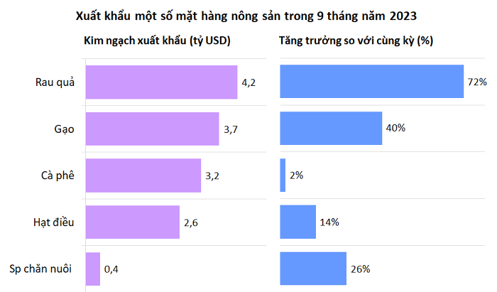 9 tháng năm 2023, do giá trị xuất khẩu của một số mặt hàng chính giảm sâu, nên tổng kim ngạch xuất khẩu ước đạt 38,48 tỷ USD, giảm 5,1% so với cùng kỳ năm ngoái. Trong số đó, nhóm thuỷ sản 6,64 tỷ USD, giảm 21,7%; lâm sản 10,44 tỷ USD, giảm 20,6%. Riêng nhóm nông sản và chăn nuôi có giá trị tăng.