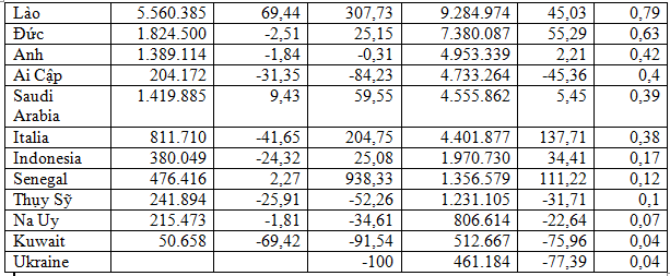 Đứng sau thị trường chủ đạo Trung Quốc là thị trường Mỹ đạt 87,05 triệu USD, chiếm 7,4%, tăng 51,7%. Xuất khẩu sang thị trường Đông Nam Á giảm 12,8% so với cùng kỳ, đạt 83,9 triệu USD; xuất khẩu sang thị trường Hàn Quốc tăng 19,5%, đạt 60,22 triệu USD, chiếm 5%.
