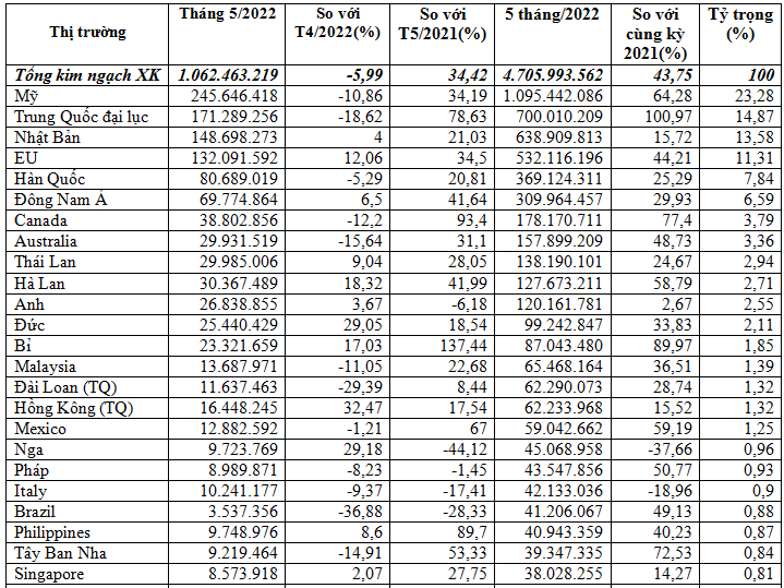 Mỹ là thị trường duy nhất đạt trên tỷ USD trong 5 tháng đầu năm, chiếm 23,3% trong tổng kim ngạch xuất khẩu nhóm hàng này của cả nước, đạt 1,1 tỷ USD, tăng mạnh 64,3% so với cùng kỳ năm 2021; trong đó riêng tháng 5/2022 đạt 245,65 triệu USD, giảm 10,9% so với tháng 4/2022 nhưng tăng mạnh 34,2% so với tháng 5/2021.