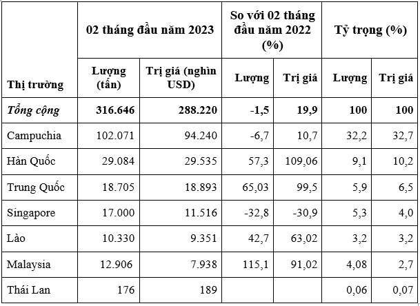 Tính chung 2 tháng đầu năm 2023 xuất khẩu đạt 316.646 tấn, trị giá 288,2 triệu USD, giảm 1,5% về lượng và tăng 19,9% về trị giá.