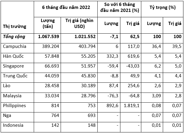 Tính chung 6 tháng đầu năm 2022 xuất khẩu đạt 1.067.539 tấn, trị giá 1,02 tỷ USD, giảm 7,1% về lượng và tăng 62,5% về trị giá.