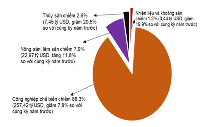 Trong 10 tháng năm 2023, có 33 mặt hàng đạt kim ngạch xuất khẩu trên 1 tỷ USD, chiếm 92,9% tổng kim ngạch xuất khẩu (có 07 mặt hàng xuất khẩu trên 10 tỷ USD, chiếm 66,2%). Về cơ cấu nhóm hàng xuất khẩu 10 tháng năm 2023, nhóm hàng nhiên liệu và khoáng sản ước đạt 3,44 tỷ USD, chiếm 1,2%; nhóm hàng công nghiệp chế biến ước đạt 257,42 tỷ USD, chiếm 88,3%; nhóm hàng nông sản, lâm sản ước đạt 22,97 tỷ USD, chiếm 7,9%; nhóm hàng thủy sản ước đạt 7,45 tỷ USD, chiếm 2,6%.