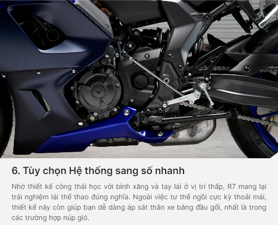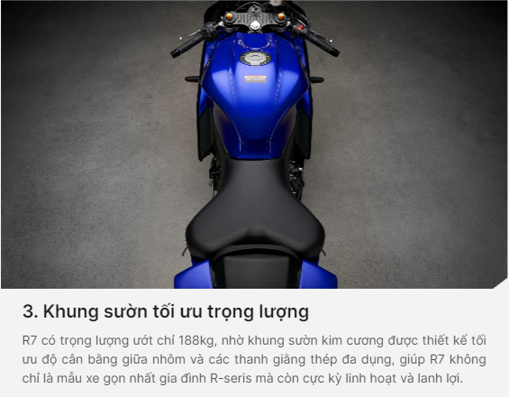 Tại thị trường Việt Nam, giá xe R7 2022 mới nhất hiện nay mới nhất đã bán chính hãng và chính thức công bố 2 phiên bản màu mới với mức giá xe Yamaha YZF R7 2022 cụ thể như sau: xe Yamaha R7 2022 màu Racing Blue có giá 269 triệu đồng và xe Yamaha R7 2022 màu Raven Black có giá 269 triệu đồng.